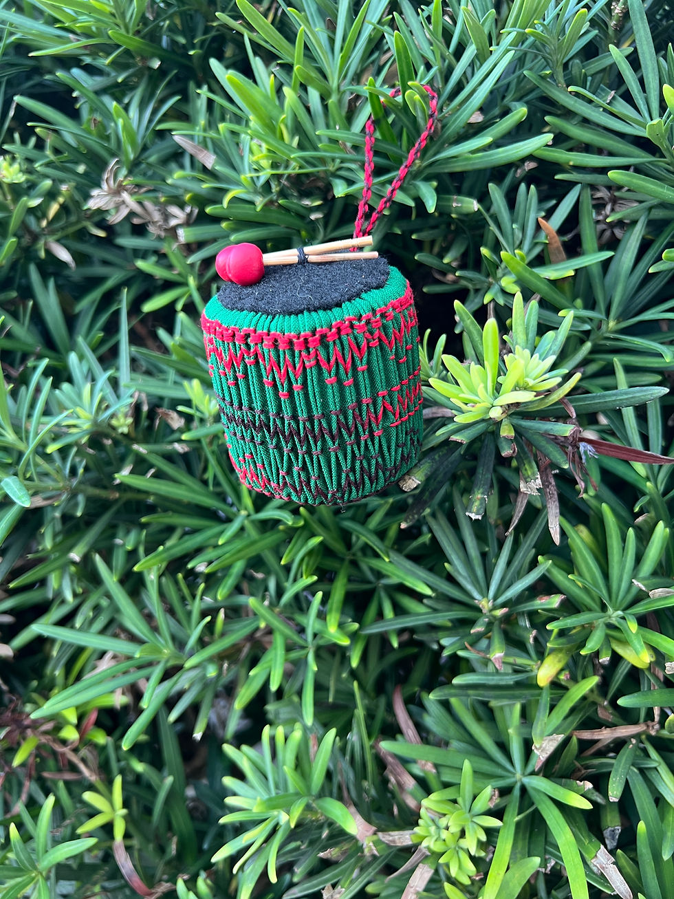 The pattern as well as detailed video instructions on prepping the fabric, stitching the Surface Honeycomb Stitch, making the drum sticks & constructing the ornament.